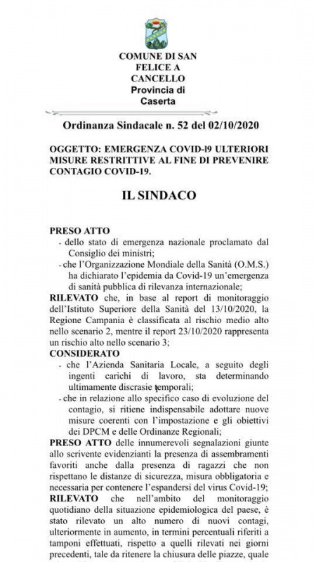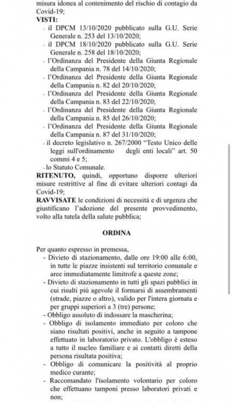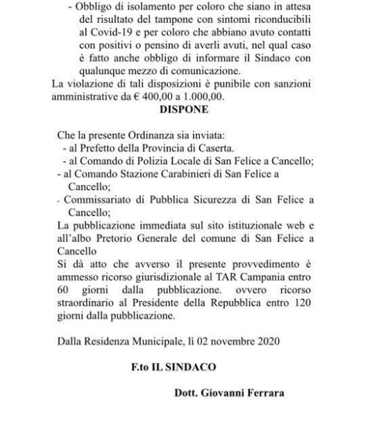 Questa l'Ordinanza del Sindaco Ferrara: