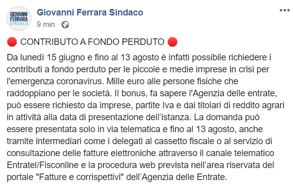 Questo quanto pubblicato sulla pagina facebook del Sindaco Ferrara: