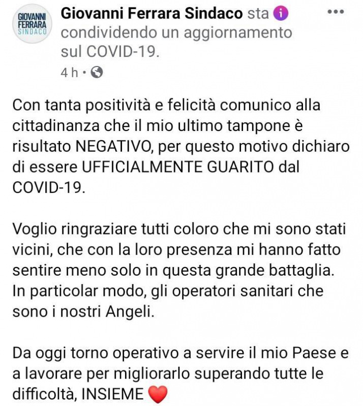 Questo quanto pubblicato sulla pagina fb del Sindaco di S.Felice a C.