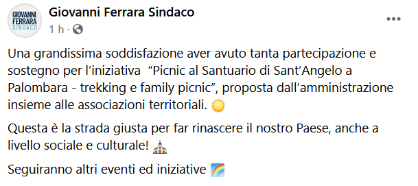 Questo il post pubblicato sulla pagina Facebook di Giovanni Ferrara, sindaco di San Felice a Cancello: "Una grandissima soddisfazione aver avuto tanta partecipazione e sostegno per l’iniziativa “Picnic al Santuario di Sant’Angelo a Palombara - trekking e family picnic”, proposta dall’amministrazione insieme alle associazioni territoriali. Questa - si legge nel post - è la strada giusta per far rinascere il nostro Paese, anche a livello sociale e culturale! Seguiranno altri eventi ed iniziative- conclude".