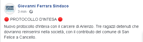Lo apprendiamo dalla pagina Facebook di Giovanni Ferrara, Sindaco di San Felice a Cancello: