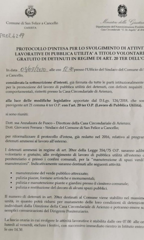 Nuovo protocollo d'intesa con il carcere di Arienzo. Tre ragazzi detenuti che dovranno reinserirsi nella società, con il contributo del comune di San Felice a Cancello."