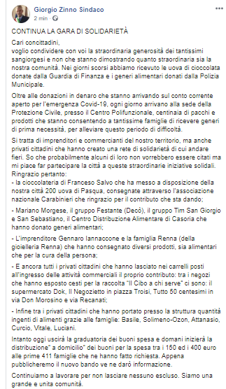 Cari concittadini, voglio condividere con voi la straordinaria generosità dei tantissimi sangiorgesi e non che stanno dimostrando quanto straordinaria sia la nostra comunità. Nei giorni scorsi abbiamo ricevuto le uova di cioccolata donate dalla Guardia di Finanza e i generi alimentari donati dalla Polizia Municipale. Oltre alle donazioni in denaro che stanno arrivando sul conto corrente aperto per l’emergenza Covid-19, ogni giorno arrivano alla sede della Protezione Civile, presso il Centro Polifunzionale, centinaia di pacchi e prodotti che stanno consentendo a tantissime famiglie di ricevere generi di prima necessità, per alleviare questo periodo di difficoltà. Si tratta di imprenditori e commercianti del nostro territorio, ma anche privati cittadini che hanno creato una rete di solidarietà di cui andare fieri. So che probabilmente alcuni di loro non vorrebbero essere citati ma mi piace far partecipare la città a queste straordinarie iniziative solidali. Ringrazio pertanto: - la cioccolateria di Franceso Salvo che ha messo a disposizione della nostra città 200 uova di Pasqua, consegnate attraverso l’associazione nazionale Carabinieri che ringrazio per il contributo che sta dando; - Mariano Morgese, il gruppo Festante (Decò), il gruppo Tim San Giorgio e San Sebastiano, il Centro Distribuzione Alimentare di Casoria che hanno donato generi alimentari; - L’imprenditore Gennaro Iannaccone e la famiglia Renna (della gioielleria Renna) che hanno consegnato diversi prodotti, sia alimentari che per la cura della persona; - E ancora tutti i privati cittadini che hanno lasciato nei carrelli posti all’ingresso delle attività commerciali il proprio contributo: tra i negozi che hanno esposto cesti per la raccolta “Il Cibo a chi serve” ci sono: il supermercato Dok, Il Negozietto in piazza Troisi, Tutto 50 centesimi in via Don Morosino e via Recanati; - Infine tra i privati cittadini che hanno portato presso la struttura quantità ingenti di alimenti grazie alle famiglie: Basile, Solimeno-Ozon, Attanasio, Curcio, Vitale, Luciani. Intanto oggi uscirà la graduatoria dei buoni spesa e domani inizierà la distribuzione” a domicilio” dei buoni per la spesa tra i 150 ed i 400 euro alle prime 411 famiglie che ne hanno fatto richiesta. Appena pubblicheremo il nuovo bando ve ne darò informazione. Continuiamo a lavorare per non lasciare nessuno escluso. Siamo una grande e unita comunità."