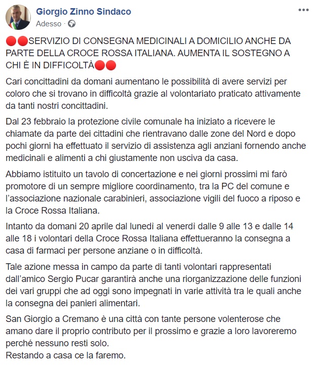 Questo quanto apprendiamo dalla pagina facebook del Sindaco Zinno: