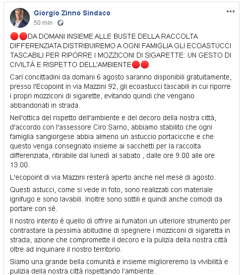 Lo apprendiamo dalla pagina Facebook di Giorgio Zinno, Sindaco di San Giorgio a Cremano.