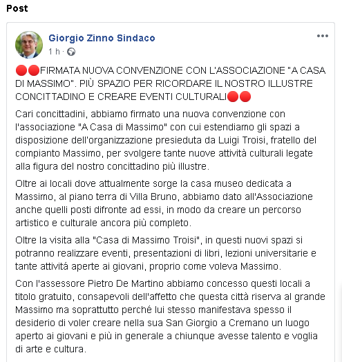 Cari concittadini, abbiamo firmato una nuova convenzione con l'associazione "A Casa di Massimo" con cui estendiamo gli spazi a disposizione dell’organizzazione presieduta da Luigi Troisi, fratello del compianto Massimo, per svolgere tante nuove attività culturali legate alla figura del nostro concittadino più illustre. Oltre ai locali dove attualmente sorge la casa museo dedicata a Massimo, al piano terra di Villa Bruno, abbiamo dato all'Associazione anche quelli posti difronte ad essi, in modo da creare un percorso artistico e culturale ancora più completo. Oltre la visita alla "Casa di Massimo Troisi", in questi nuovi spazi si potranno realizzare eventi, presentazioni di libri, lezioni universitarie e tante attivitá aperte ai giovani, proprio come voleva Massimo. Con l'assessore Pietro De Martino abbiamo concesso questi locali a titolo gratuito, consapevoli dell'affetto che questa città riserva al grande Massimo ma soprattutto perché lui stesso manifestava spesso il desiderio di voler creare nella sua San Giorgio a Cremano un luogo aperto ai giovani e più in generale a chiunque avesse talento e voglia di arte e cultura."