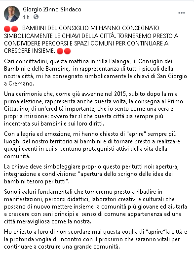 Cari concittadini, questa mattina in Villa Falanga, il Consiglio dei Bambini e delle Bambine, in rappresentanza di tutti i piccoli della nostra città, mi ha consegnato simbolicamente le chiavi di San Giorgio a Cremano. Una cerimonia che, come già avvenne nel 2015, subito dopo la mia prima elezione, rappresenta anche questa volta, la consegna al Primo Cittadino, di un'ereditá importante, che io sento come una vera e propria missione: ovvero far sì che questa città sia sempre più incentrata sui bambini e sui loro diritti.