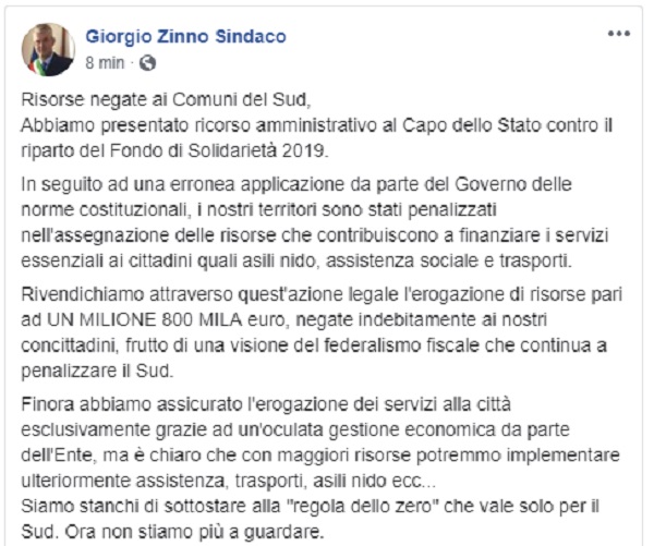 Questo il post pubblicato sulla pagina fb ufficiale del Sindaco di San Giorgio a Cremano Giorgio Zinno.