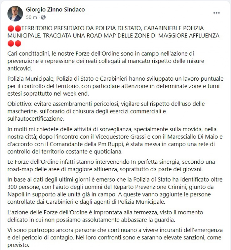 Questo quanto pubblicato sulla pagina FB del Sindaco Zinno