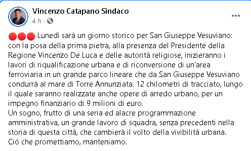 Lo apprendiamo dalla pagina Facebook di Vincenzo Catapano, Sindaco di San Giuseppe Vesuviano.