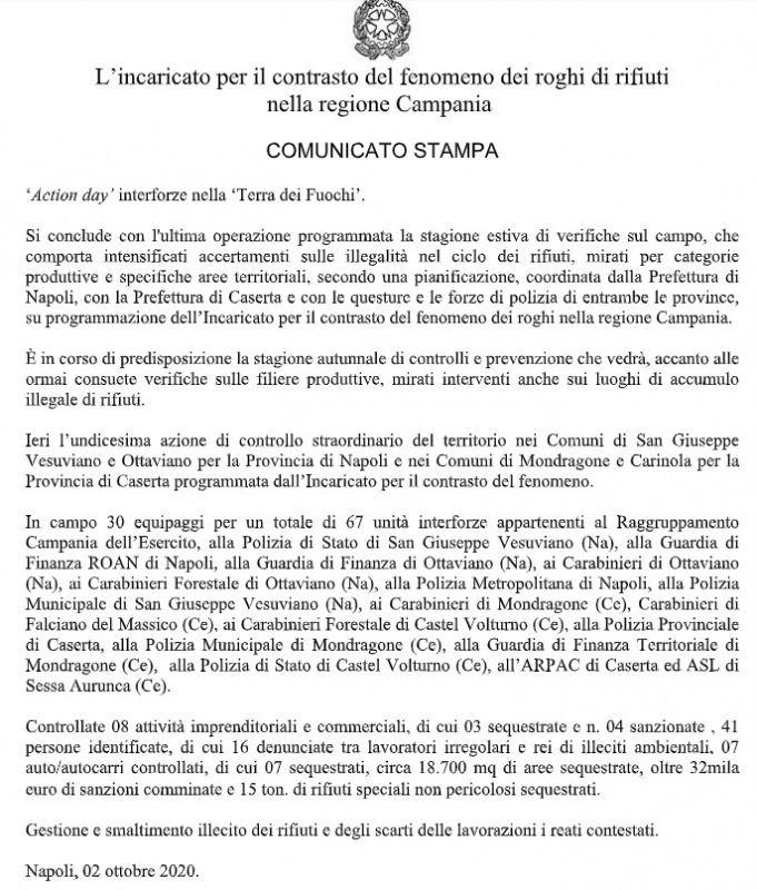 Pubblichiamo nota stampa dell'incaricato per il contrasto del fenomeno dei roghi di rifiuti nella regione Campania: