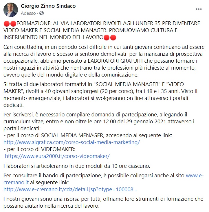 Cari concittadini, in un periodo così difficile in cui tanti giovani continuano ad essere alla ricerca di lavoro e spesso si sentono demotivati per la mancanza di prospettiva occupazionale, abbiamo pensato a LABORATORI GRATUITI che possano- si legge nella nota- formare i nostri ragazzi in attività che rientrano tra le professioni più richieste al momento, ovvero quelle del mondo digitale e della comunicazione. Si tratta di due laboratori formativi in "SOCIAL MEDIA MANAGER" E "VIDEO MAKER", rivolti a 40 giovani sangiorgesi (20 per corso), tra i 18 e i 35 anni. Visto il momento emergenziale, i laboratori si svolgeranno on line attraverso i portali dedicati.