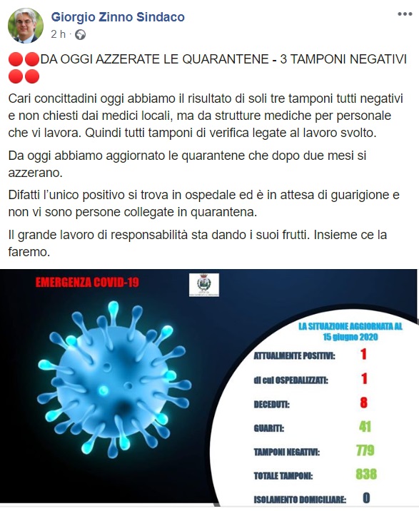 Questo quanto pubblicato sulla pagina facebook del Sindaco Zinno: