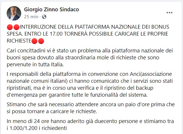Questo quanto pubblicato sulla pagina fb del Sindaco Zinno