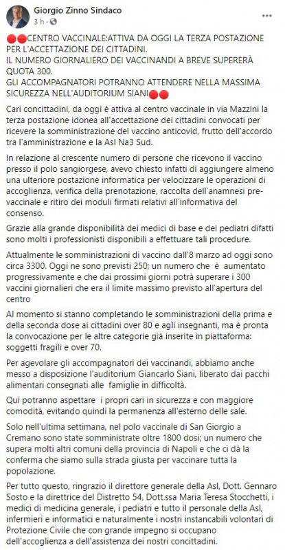 "CENTRO VACCINALE:ATTIVA DA OGGI LA TERZA POSTAZIONE PER L'ACCETTAZIONE DEI CITTADINI. IL NUMERO GIORNALIERO DEI VACCINANDI A BREVE SUPERERÀ QUOTA 300. GLI ACCOMPAGNATORI POTRANNO ATTENDERE NELLA MASSIMA SICUREZZA NELL'AUDITORIUM SIANI. Cari concittadini, da oggi è attiva al centro vaccinale in via Mazzini la terza postazione idonea all'accettazione dei cittadini convocati per ricevere la somministrazione del vaccino anticovid, frutto dell'accordo tra l'amministrazione e la Asl Na3 Sud. In relazione al crescente numero di persone che ricevono il vaccino presso il polo sangiorgese, avevo chiesto- si legge nella nota- infatti di aggiungere almeno una ulteriore postazione informatica per velocizzare le operazioni di accoglienza, verifica della prenotazione, raccolta dell’anamnesi pre-vaccinale e ritiro dei moduli firmati relativi all’informativa del consenso. Grazie alla grande disponibilità dei medici di base e dei pediatri difatti sono molti i professionisti disponibili a effettuare tali procedure. Attualmente le somministrazioni di vaccino dall'8 marzo ad oggi sono circa 3300. Oggi ne sono previsti 250; un numero che è aumentato progressivamente e che dai prossimi giorni potrà superare i 300 vaccini giornalieri che era il limite massimo previsto all’apertura del centro Al momento si stanno completando le somministrazioni della prima e della seconda dose ai cittadini over 80 e agli insegnanti, ma è pronta la convocazione per le altre categorie già inserite- si legge nella nota- in piattaforma: soggetti fragili e over 70. Per agevolare gli accompagnatori dei vaccinandi, abbiamo anche messo a disposizione l'auditorium Giancarlo Siani, liberato dai pacchi alimentari consegnati alle famiglie in difficoltà. Qui potranno aspettare i propri cari in sicurezza e con maggiore comodità, evitando quindi la permanenza all'esterno delle sale. Solo nell'ultima settimana, nel polo vaccinale di San Giorgio a Cremano sono state somministrate oltre 1800 dosi; un numero che supera molti altri comuni della provincia di Napoli e che ci dà la conferma che siamo sulla strada giusta per vaccinare tutta la popolazione. Per tutto questo, ringrazio il direttore generale della Asl, Dott. Gennaro Sosto e la direttrice del Distretto 54, Dott.ssa Maria Teresa Stocchetti, i medici di medicina generale, i pediatri e tutto il personale della Asl, infermieri e informatici e naturalmente i nostri instancabili volontari di Protezione Civile che con grande impegno si occupano- si legge nella nota- dell'accoglienza a dell'assistenza dei nostri concittadini."