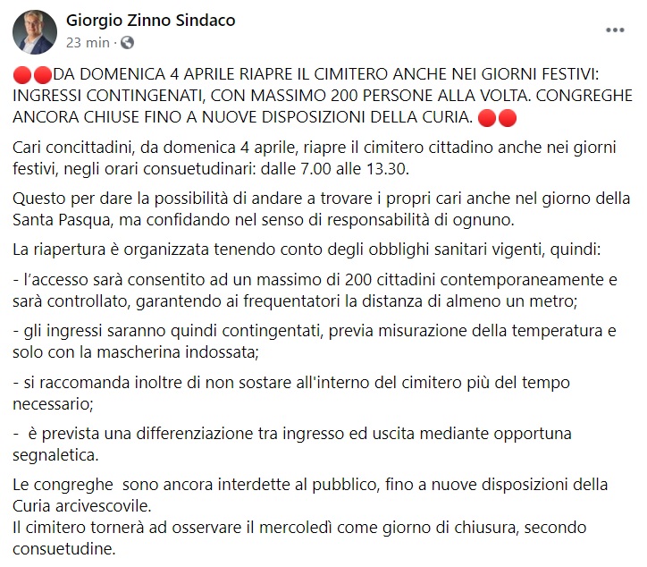 Questo quanto apprendiamo dalla pagina fb del Sindaco Zinno: "DA DOMENICA 4 APRILE RIAPRE IL CIMITERO ANCHE NEI GIORNI FESTIVI: INGRESSI CONTINGENATI, CON MASSIMO 200 PERSONE ALLA VOLTA. CONGREGHE ANCORA CHIUSE FINO A NUOVE DISPOSIZIONI DELLA CURIA. Cari concittadini, da domenica 4 aprile, riapre il cimitero cittadino anche nei giorni festivi - si legge nella nota -, negli orari consuetudinari: dalle 7.00 alle 13.30. Questo per dare la possibilità di andare a trovare i propri cari anche nel giorno della Santa Pasqua, ma confidando nel senso di responsabilità di ognuno. La riapertura è organizzata tenendo conto degli obblighi sanitari vigenti, quindi: - l’accesso sarà consentito ad un massimo di 200 cittadini contemporaneamente e sarà controllato - si legge nella nota -, garantendo ai frequentatori la distanza di almeno un metro; - gli ingressi saranno quindi contingentati, previa misurazione della temperatura e solo con la mascherina indossata; - si raccomanda inoltre di non sostare all'interno del cimitero più del tempo necessario; - è prevista una differenziazione tra ingresso ed uscita mediante opportuna segnaletica. Le congreghe sono ancora interdette al pubblico, fino a nuove disposizioni della Curia arcivescovile - si legge nella nota -. Il cimitero tornerà ad osservare il mercoledì come giorno di chiusura, secondo consuetudine."