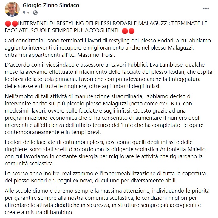 "Cari concittadini, sono terminati i lavori di restyling del plesso Rodari, a cui abbiamo aggiunto interventi di recupero e miglioramento anche nel plesso Malaguzzi, entrambi appartenenti all'I.C. Massimo Troisi. D'accordo con il vicesindaco e assessore ai Lavori Pubblici, Eva Lambiase, qualche mese fa avevamo effettuato il rifacimento delle facciate del plesso Rodari, che ospita le classi della scuola primaria. -Si legge nella nota- Lavori che comprendevano anche la tinteggiatura delle stesse e di tutte le ringhiere, oltre agli imbotti degli infissi. Nell'ambito di tali attività di manutenzione straordinaria, abbiamo deciso di intervenire anche sul più piccolo plesso Malaguzzi (noto come ex C.R.I.) con medesimi lavori, ovvero sulle facciate e sugli infissi. Questo grazie ad una programmazione economica che ci ha consentito di aumentare il numero degli interventi e all'efficienza dell'ufficio tecnico dell'Ente che ha completato le opere contemporaneamente e in tempi brevi. I colori delle facciate di entrambi i plessi, così come quelli degli infissi e delle ringhiere, sono stati scelti d'accordo con la dirigente scolastica Antonietta Maiello, con cui lavoriamo in costante sinergia per migliorare le attività che riguardano la comunità scolastica. -Si legge nella nota- Lo scorso anno inoltre, realizzammo e l'impermeabilizzazione di tutta la copertura del plesso Rodari e 5 bagni ex novo, di cui uno per diversamente abili. Alle scuole diamo e daremo sempre la massima attenzione, individuando le priorità per garantire sempre alla nostra comunità scolastica, le condizioni migliori per affrontare le attività didattiche in sicurezza, in strutture sempre più accoglienti e create a misura di bambino."