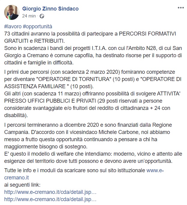 Questo quanto pubblicato sulla pagina facebook del Sindaco Zinno: