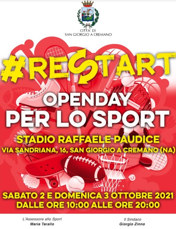 Pubblichiamo nota stampa Comune di San Giorgio a Cremano: "Al via il primo "Open day per lo sport" Due giorni no stop dedicati alle discipline sportive, Zinno: "Diamo slancio alle associazioni che hanno investito sul nostro territorio e promuoviamo i valori dello sport"