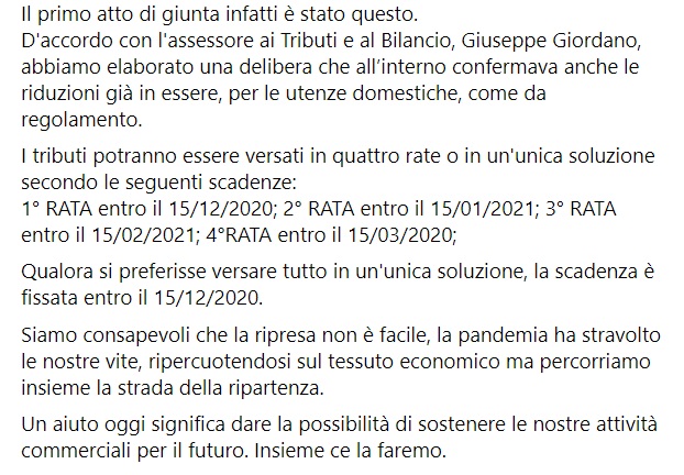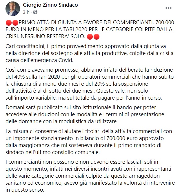 Questo quanto pubblicato sulla pagina facebook del Sindaco Zinno: