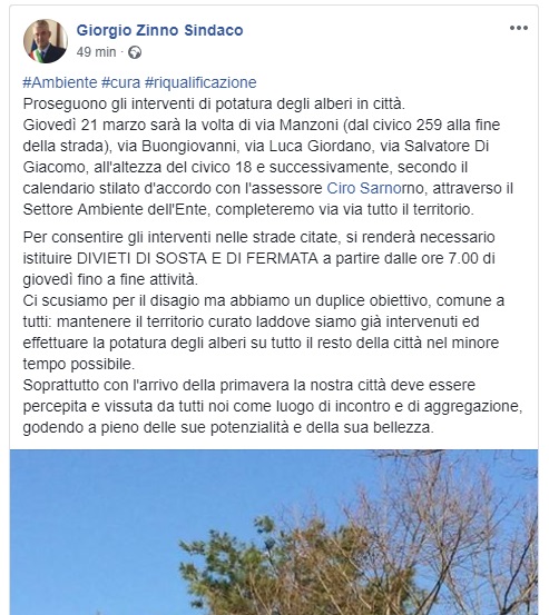Interventi di potatura degli alberi in tutta la città a San Giorgio a Cremano, così come comunicato dal Sindaco Giorgio Zinno.