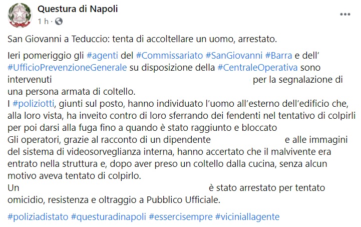 "San Giovanni a Teduccio: tenta di accoltellare un uomo, arrestato. Ieri pomeriggio gli #agenti del #Commissariato #SanGiovanni #Barra e dell’ #UfficioPrevenzioneGenerale su disposizione della #CentraleOperativa sono intervenuti ... per la segnalazione- si legge nella nota- di una persona armata di coltello. I #poliziotti, giunti sul posto, hanno individuato l’uomo all’esterno dell’edificio che, alla loro vista, ha inveito contro di loro sferrando dei fendenti nel tentativo di colpirli per poi darsi alla fuga fino a quando è stato raggiunto e bloccato ... Gli operatori, grazie al racconto di un dipendente ... e alle immagini del sistema di videosorveglianza interna, hanno accertato che il malvivente era entrato nella struttura e, dopo aver preso un coltello dalla cucina, senza alcun motivo aveva tentato di colpirlo. Un ... è stato arrestato- si legge nella nota- per tentato omicidio, resistenza e oltraggio a Pubblico Ufficiale."