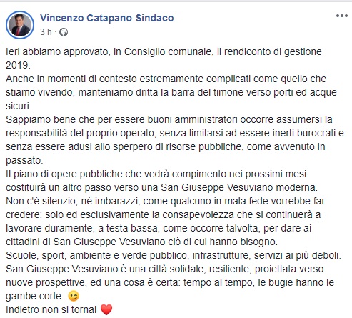Questo quanto apprendiamo dalla pagina facebook del Sindaco Catapano: