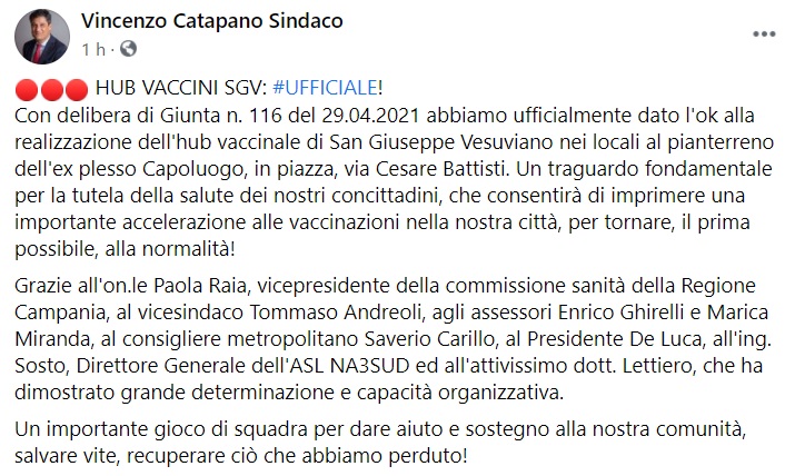 Questo quanto apprendiamo dalla pagina fb del Sindaco di S.Giuseppe Vesuviano: "HUB VACCINI SGV: UFFICIALE! Con delibera di Giunta n. 116 del 29.04.2021 abbiamo ufficialmente dato l'ok alla realizzazione dell'hub vaccinale di San Giuseppe Vesuviano - si legge nella nota - nei locali al pianterreno dell'ex plesso Capoluogo, in piazza, via Cesare Battisti. Un traguardo fondamentale per la tutela della salute dei nostri concittadini, che consentirà di imprimere una importante accelerazione alle vaccinazioni nella nostra città, per tornare, il prima possibile - si legge nella nota -, alla normalità! Grazie all'on.le Paola Raia, vicepresidente della commissione sanità della Regione Campania, al vicesindaco Tommaso Andreoli, agli assessori Enrico Ghirelli e Marica Miranda, al consigliere metropolitano Saverio Carillo, al Presidente De Luca, all'ing. Sosto, Direttore Generale dell'ASL NA3SUD ed all'attivissimo dott. Lettiero, che ha dimostrato grande determinazione e capacità organizzativa. Un importante gioco di squadra per dare aiuto e sostegno alla nostra comunità - si legge nella nota -, salvare vite, recuperare ciò che abbiamo perduto!"