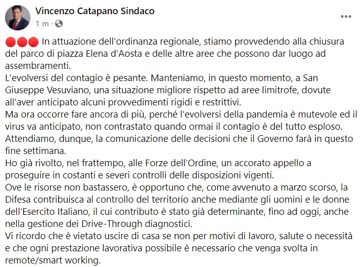 "In attuazione dell'ordinanza regionale, stiamo provvedendo alla chiusura del parco di piazza Elena d'Aosta e delle altre aree che possono dar luogo ad assembramenti. L'evolversi del contagio è pesante. Manteniamo, in questo momento, a San Giuseppe Vesuviano, una situazione migliore- si legge nella nota- rispetto ad aree limitrofe, dovute all'aver anticipato alcuni provvedimenti rigidi e restrittivi. Ma ora occorre fare ancora di più, perché l'evolversi della pandemia è mutevole ed il virus va anticipato, non contrastato quando ormai il contagio è del tutto esploso. Attendiamo, dunque, la comunicazione delle decisioni che il Governo farà in questo fine settimana. Ho già rivolto, nel frattempo, alle Forze dell'Ordine, un accorato appello a proseguire in costanti e severi controlli delle disposizioni vigenti. Ove le risorse non bastassero, è opportuno che, come avvenuto a marzo scorso, la Difesa contribuisca al controllo del territorio anche mediante gli uomini e le donne dell'Esercito Italiano, il cui contributo- si legge nella nota- è stato già determinante, fino ad oggi, anche nella gestione dei Drive-Through diagnostici. Vi ricordo che è vietato uscire di casa se non per motivi di lavoro, salute o necessità e che ogni prestazione lavorativa possibile è necessario che venga svolta in remote/smart working."