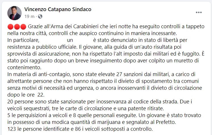 Questo quanto apprendiamo dalla pagina facebook del Sindaco di S.Giuseppe Vesuviano: "Grazie all'Arma dei Carabinieri che ieri notte ha eseguito controlli a tappeto nella nostra città, controlli che auspico continuino in maniera incessante. In particolare, ... un ... è stato denunciato in stato di libertà per resistenza a pubblico ufficiale. Il giovane - si legge nella nota -, alla guida di un’auto risultata poi sprovvista di assicurazione, non ha rispettato l’alt imposto dai militari ed è fuggito. È stato poi raggiunto dopo un breve inseguimento dopo aver colpito un muretto di contenimento. In materia di anti-contagio, sono state elevate 27 sanzioni dai militari, a carico di altrettante persone che non hanno rispettato il divieto di spostamento tra comuni senza motivi di necessità ed urgenza, o ancora inosservanti il divieto di circolazione dopo le ore 22. 20 persone sono state sanzionate per inosservanza al codice della strada. Due i veicoli sequestrati - si legge nella nota -, tre le carte di circolazione e una patente ritirate. 5 le perquisizioni a veicoli e 8 quelle personali eseguite. Un giovane è stato trovato in possesso di una modica quantità di marijuana e segnalato al Prefetto. 123 le persone identificate e 86 i veicoli sottoposti a controllo."