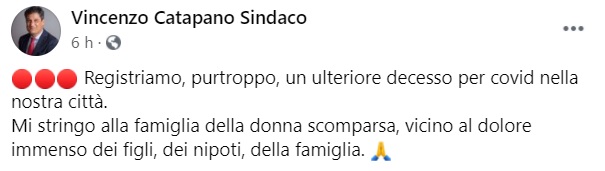 "Registriamo, purtroppo, un ulteriore decesso per covid nella nostra città. Mi stringo- si legge nella nota- alla famiglia della donna scomparsa, vicino al dolore immenso dei figli, dei nipoti, della famiglia"