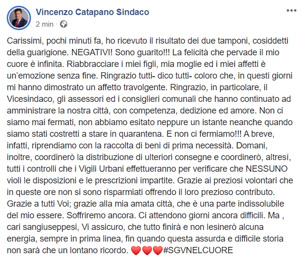 Questo quanto pubblicato sulla pagina facebook del Sindaco Catapano: