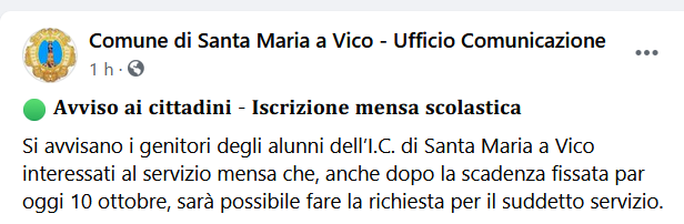 Questo il post pubblicato sulla pagina Facebook del Comune di Santa Maria a Vico: "Si avvisano i genitori degli alunni dell’I.C. di Santa Maria a Vico interessati al servizio mensa che, anche dopo la scadenza fissata per oggi 10 ottobre, sarà possibile - recita il post - fare la richiesta per il suddetto servizio".