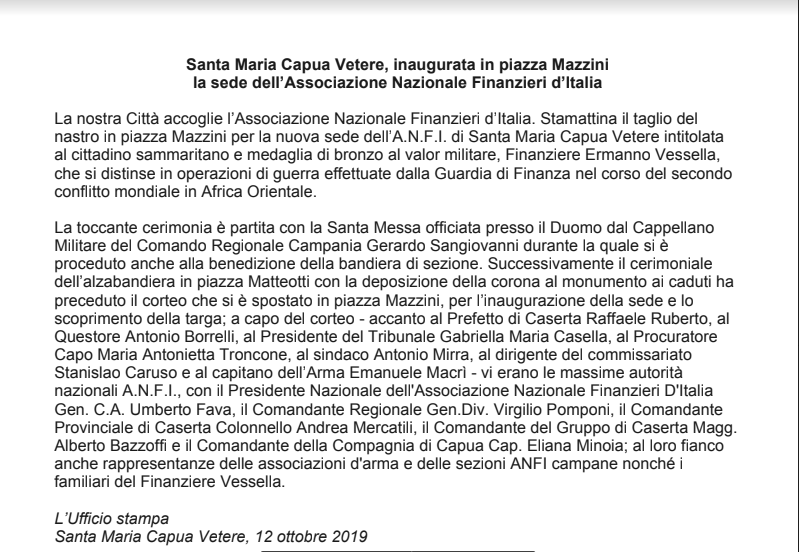 S.M.C.V. Inaugurata in piazza Mazzini la sede dell'Associazione Nazionale Finanzieri d'Italia