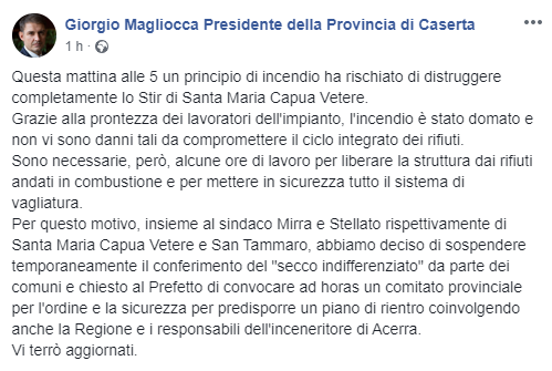 Grazie alla prontezza dei lavoratori dell'impianto, l'incendio è stato domato e non vi sono danni tali da compromettere il ciclo integrato dei rifiuti. Sono necessarie, però, alcune ore di lavoro per liberare la struttura dai rifiuti andati in combustione e per mettere in sicurezza tutto il sistema di vagliatura. Per questo motivo, insieme al sindaco Mirra e Stellato rispettivamente di Santa Maria Capua Vetere e San Tammaro, abbiamo deciso di sospendere temporaneamente il conferimento del "secco indifferenziato" da parte dei comuni e chiesto al Prefetto di convocare ad horas un comitato provinciale per l'ordine e la sicurezza per predisporre un piano di rientro coinvolgendo anche la Regione e i responsabili dell'inceneritore di Acerra. Vi terrò aggiornati."