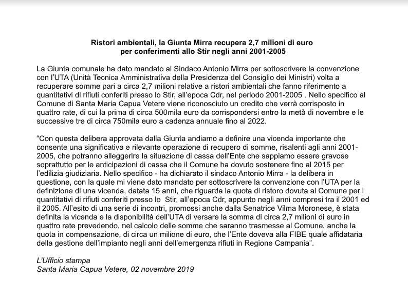 Di seguito, il testo del comunicato del Comune di Santa Maria Capua Vetere, giunto in redazione: