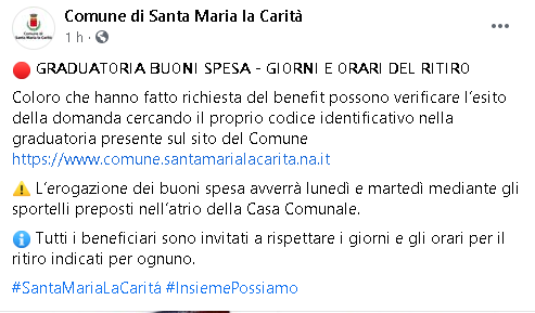 S.M. la Carità. GRADUATORIA BUONI SPESA, GIORNI E ORARI DEL RITIRO