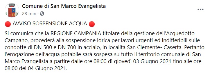 "Si comunica che la REGIONE CAMPANIA titolare della gestione dell’Acquedotto Campano, procederà alla sospensione idrica per lavori urgenti ed indifferibili sulle condotte di DN 500 e DN 700 in acciaio, in località San Clemente- Caserta. -Si legge nella nota- Pertanto l’erogazione dell’acqua potabile sarà sospesa su tutto il territorio comunale di San Marco Evangelista a partire dalle ore 08:00 dì giovedì 03 Giugno 2021 fino alle ore 08:00 del 04 Giugno 2021."