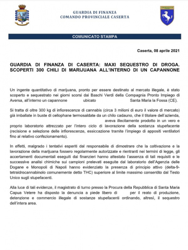 Questa parte della nota stampa della Guardia di Finanza di Caserta:
