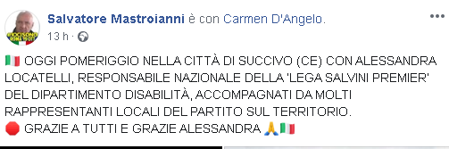 Lo apprendiamo dalla pagina Facebook di Salvatore Mastroianni, Cons. comunale della città di Santa Maria Capua Vetere (Ce) e Coordinatore Provinciale ‘Lega Salvini Premier’ Caserta.