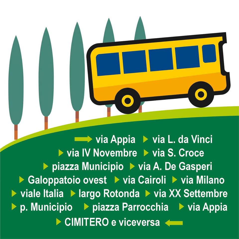 "Buone abitudini che si rinnovano: anche quest’anno, in occasione della commemorazione dei defunti, i cittadini di San Nicola la Strada avranno a disposizione un servizio di trasporto pubblico gratuito verso il Cimitero comunale. L’iniziativa, oltre ad agevolare quanti vorranno recarsi presso la struttura, contribuirà ad alleggerire il traffico automobilistico che, come sempre accade in questa ricorrenza, sarà piuttosto intenso. Come negli anni passati, gli Assessori comunali, il Presidente del Consiglio e il Sindaco hanno messo a disposizione una parte delle proprie indennità di amministratori per finanziare le spese del pullman. La navetta sarà in funzione nei giorni 1 e 2 novembre 2019 e percorrerà questo itinerario: via Appia • via L. da Vinci • via IV Novembre • via S. Croce • piazza Municipio • via A. De Gasperi • Galoppatoio ovest • via Cairoli • via Milano • viale Italia • largo Rotonda • via XX Settembre • piazza Municipio • piazza Parrocchia • via Appia • Cimitero e viceversa."