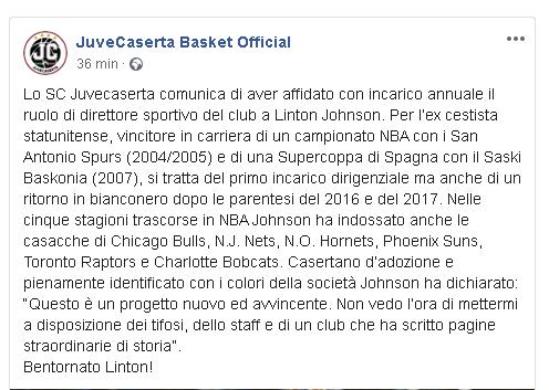 "Lo SC Juvecaserta comunica di aver affidato con incarico annuale il ruolo di direttore sportivo del club a Linton Johnson. Per l’ex cestista statunitense, vincitore in carriera di un campionato NBA con i San Antonio Spurs (2004/2005) e di una Supercoppa di Spagna con il Saski Baskonia (2007), si tratta del primo incarico dirigenziale ma anche di un ritorno in bianconero dopo le parentesi del 2016 e del 2017. Nelle cinque stagioni trascorse in NBA Johnson ha indossato anche le casacche di Chicago Bulls, N.J. Nets, N.O. Hornets, Phoenix Suns, Toronto Raptors e Charlotte Bobcats. Casertano d’adozione e pienamente identificato con i colori della società Johnson ha dichiarato: “Questo è un progetto nuovo ed avvincente. Non vedo l’ora di mettermi a disposizione dei tifosi, dello staff e di un club che ha scritto pagine straordinarie di storia”. Bentornato Linton!"