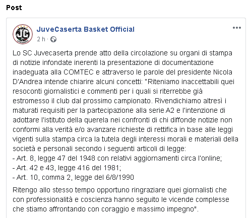 "Lo SC Juvecaserta prende atto della circolazione su organi di stampa di notizie infondate inerenti la presentazione di documentazione inadeguata alla COMTEC e attraverso le parole del presidente Nicola D’Andrea intende chiarire alcuni concetti: “Riteniamo inaccettabili quei resoconti giornalistici e commenti per i quali si riterrebbe già estromesso il club dal prossimo campionato. Rivendichiamo altresì i maturati requisiti per la partecipazione alla serie A2 e l’intenzione di adottare l’istituto della querela nei confronti di chi diffonde notizie non conformi alla verità e/o avanzare richieste di rettifica in base alle leggi vigenti sulla stampa circa la tutela degli interessi morali e materiali della società e personali secondo i seguenti articoli di legge: