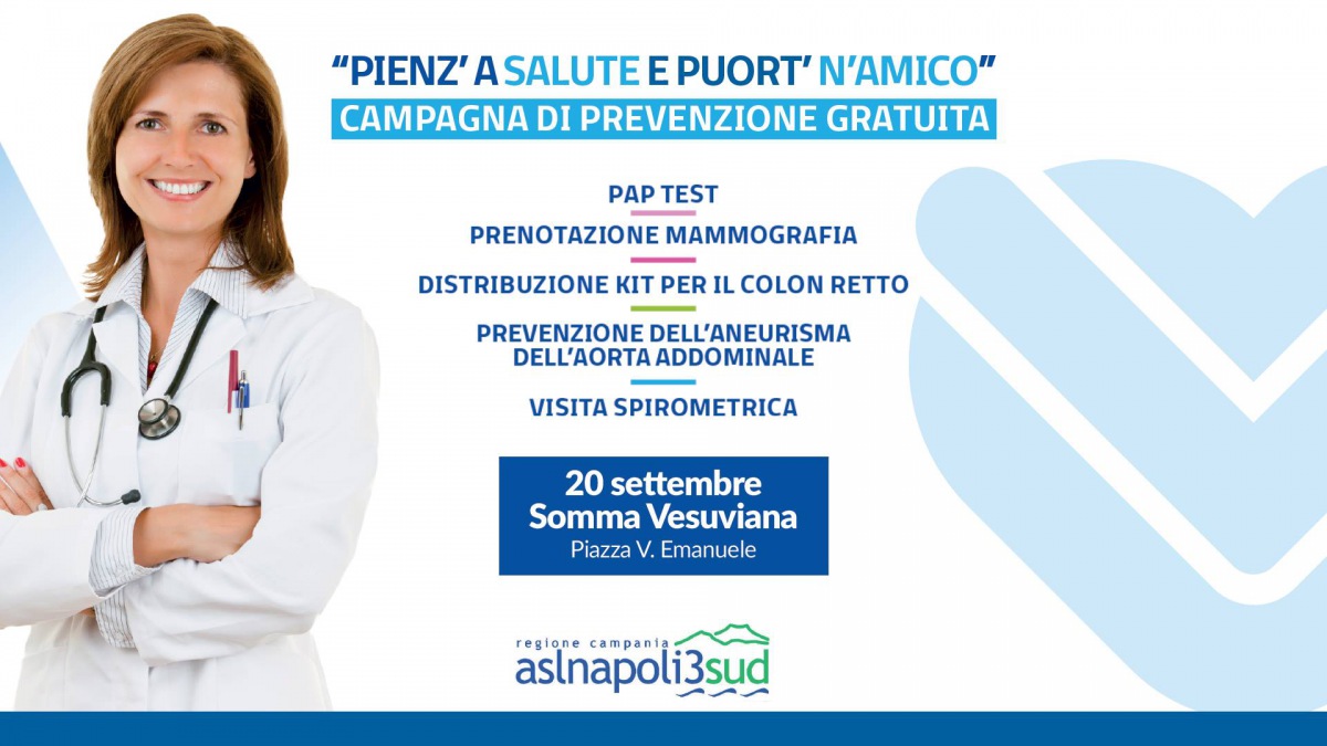 "SOMMA VESUVIANA. Un tour del benessere organizzato dall’Azienda Sanitaria, in collaborazione con il Comune, che mette a disposizione le proprie strutture nel segno della prevenzione e non soltanto. Appuntamento a Somma Vesuviana venerdì 20 settembre in piazza Vittorio Emanuele III dalle ore 9:30 alle 18. -spiega la nota-I medici e gli operatori dell'Asl Napoli 3 sud saranno in piazza per eseguire il paptest per le donne (di età compresa tra i 25 e i 64 anni), consegnare i kit per la diagnosi precoce del tumore del colon retto (uomini e donne tra i 50 e i 74 anni), prenotare la mammografia -spiega la nota-(donne di età compresa tra i 25 e i 64 anni). Effettuare spirometria ed ecografie per la prevenzione dell’aneurisma dell’aorta addominale. L’iniziativa si inquadra nelle scelte della direzione strategica Asl Napoli 3 Sud rivolte al coinvolgimento diretto dei cittadini, -spiega la nota-anche attraverso l’impegno dei medici di famiglia, nei programmi di screening e di prevenzione data la costante scarsa partecipazione. In piazza saranno presenti anche medici veterinari con il loro camper per l'applicazione gratuita del microchip,-spiega la nota- un servizio disponibile per i residenti del territorio della Asl Napoli 3 Sud. I cani dovranno essere accompagnati da persone maggiorenni, muniti di documento d'identità e tessera sanitaria. Inoltre sarà possibile avere informazioni sulla salute del proprio amico a quattro zampe.-spiega la nota-“La prevenzione è importante”, spiega il sindaco Salvatore Di Sarno, “spesso è l’unico modo per salvarsi la vita e altrettanto spesso capita che, per motivi economici, la gente eviti di effettuare i dovuti controlli. -spiega la nota-Ragioni che ci hanno spinto, fin da subito, ad accettare la fattiva collaborazione dell’Asl ed organizzare anche nella nostra Somma una tappa del tour che i medici dell’azienda sanitaria stanno effettuando per tutelare la salute pubblica. Invito i nostri cittadini ad essere presenti, vi aspettiamo in piazza non pensateci troppo, il vostro benessere è importante. Tutti i servizi vengono erogati gratuitamente e senza alcuna prenotazione."
