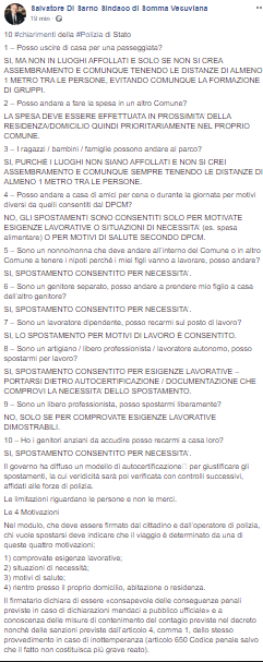 3 – I ragazzi / bambini / famiglie possono andare al parco? SI, PURCHÉ I LUOGHI NON SIANO AFFOLLATI E NON SI CREI ASSEMBRAMENTO E COMUNQUE SEMPRE TENENDO LE DISTANZE DI ALMENO 1 METRO TRA LE PERSONE. 4 – Posso andare a casa di amici per cena o durante la giornata per motivi diversi da quelli consentiti dal DPCM? NO, GLI SPOSTAMENTI SONO CONSENTITI SOLO PER MOTIVATE ESIGENZE LAVORATIVE O SITUAZIONI DI NECESSITA’ (es. spesa alimentare) O PER MOTIVI DI SALUTE SECONDO DPCM. 5 – Sono un nonno/nonna che deve andare all’interno del Comune o in altro Comune a tenere i nipoti perché i miei figli vanno a lavorare, posso andare? SI, SPOSTAMENTO CONSENTITO PER NECESSITA’. 6 – Sono un genitore separato, posso andare a prendere mio figlio a casa dell’altro genitore? SI, SPOSTAMENTO CONSENTITO PER NECESSITA’. 7 – Sono un lavoratore dipendente, posso recarmi sul posto di lavoro? SI, LO SPOSTAMENTO PER MOTIVI DI LAVORO É CONSENTITO. 8 – Sono un artigiano / libero professionista / lavoratore autonomo, posso spostarmi per lavoro? SI, SPOSTAMENTO CONSENTITO PER ESIGENZE LAVORATIVE – PORTARSI DIETRO AUTOCERTIFICAZIONE / DOCUMENTAZIONE CHE COMPROVI LA NECESSITA’ DELLO SPOSTAMENTO. 9 – Sono un libero professionista, posso spostarmi liberamente? NO, SOLO SE PER COMPROVATE ESIGENZE LAVORATIVE DIMOSTRABILI. 10 – Ho i genitori anziani da accudire posso recarmi a casa loro? SI, SPOSTAMENTO CONSENTITO PER NECESSITA’. Il governo ha diffuso un modello di autocertificazione per giustificare gli spostamenti, la cui veridicità sarà poi verificata con controlli successivi, affidati alle forze di polizia. Le limitazioni riguardano le persone e non le merci. Le 4 Motivazioni