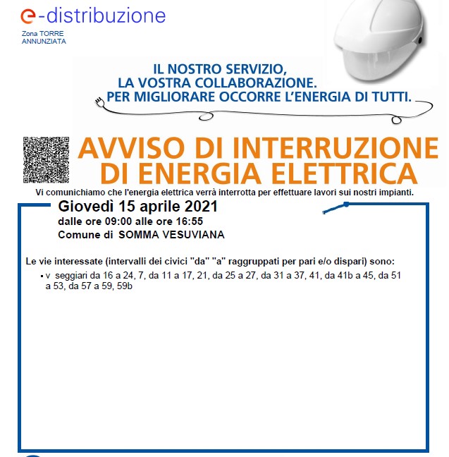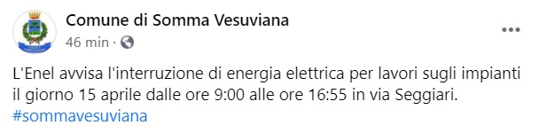 Questo quanto pubblicato sulla pagina fb del Comune di Somma Vesuviana: "L'Enel avvisa l'interruzione di energia elettrica per lavori sugli impianti il giorno 15 aprile - si legge nella nota - dalle ore 9:00 alle ore 16:55 in via Seggiari."