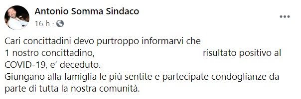"Cari concittadini devo purtroppo informarvi- si legge nella nota- che 1 nostro concittadino,... risultato positivo al COVID-19, e’ deceduto. Giungano alla famiglia le più sentite e partecipate condoglianze da parte di tutta la nostra comunità."