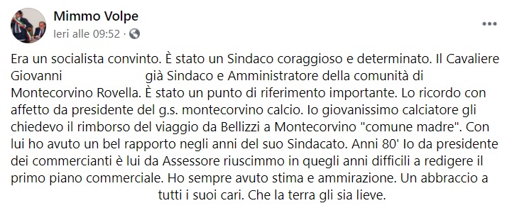 "Era un socialista convinto. È stato un Sindaco coraggioso e determinato. Il Cavaliere Giovanni ... già Sindaco e Amministratore della comunità di Montecorvino Rovella. È stato un punto di riferimento importante. Lo ricordo con affetto da presidente del g.s. montecorvino calcio. Io giovanissimo calciatore- si legge nella nota- gli chiedevo il rimborso del viaggio da Bellizzi a Montecorvino "comune madre". Con lui ho avuto un bel rapporto negli anni del suo Sindacato. Anni 80' Io da presidente dei commercianti è lui da Assessore riuscimmo in quegli anni difficili a redigere il primo piano commerciale. Ho sempre avuto stima e- si legge nella nota- ammirazione. Un abbraccio ... a tutti i suoi cari. Che la terra gli sia lieve."