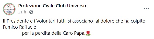 "Il Presidente e i Volontari tutti, si associano al dolore che ha colpito- si legge nella nota- l'amico Raffaele ... per la perdita del Caro Papà"