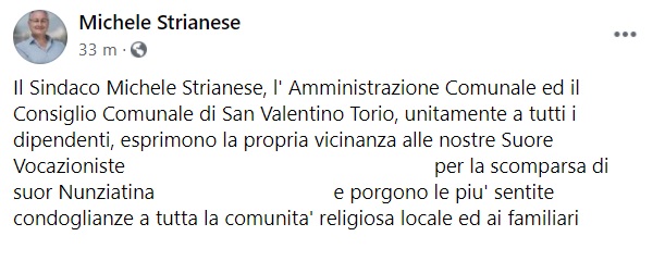 "Il Sindaco Michele Strianese, l' Amministrazione Comunale ed il Consiglio Comunale di San Valentino Torio, unitamente a tutti i dipendenti, esprimono la propria vicinanza alle nostre Suore Vocazioniste ... per la scomparsa di suor Nunziatina ... e porgono le piu' sentite condoglianze a tutta la comunita' religiosa locale ed ai familiari ..."